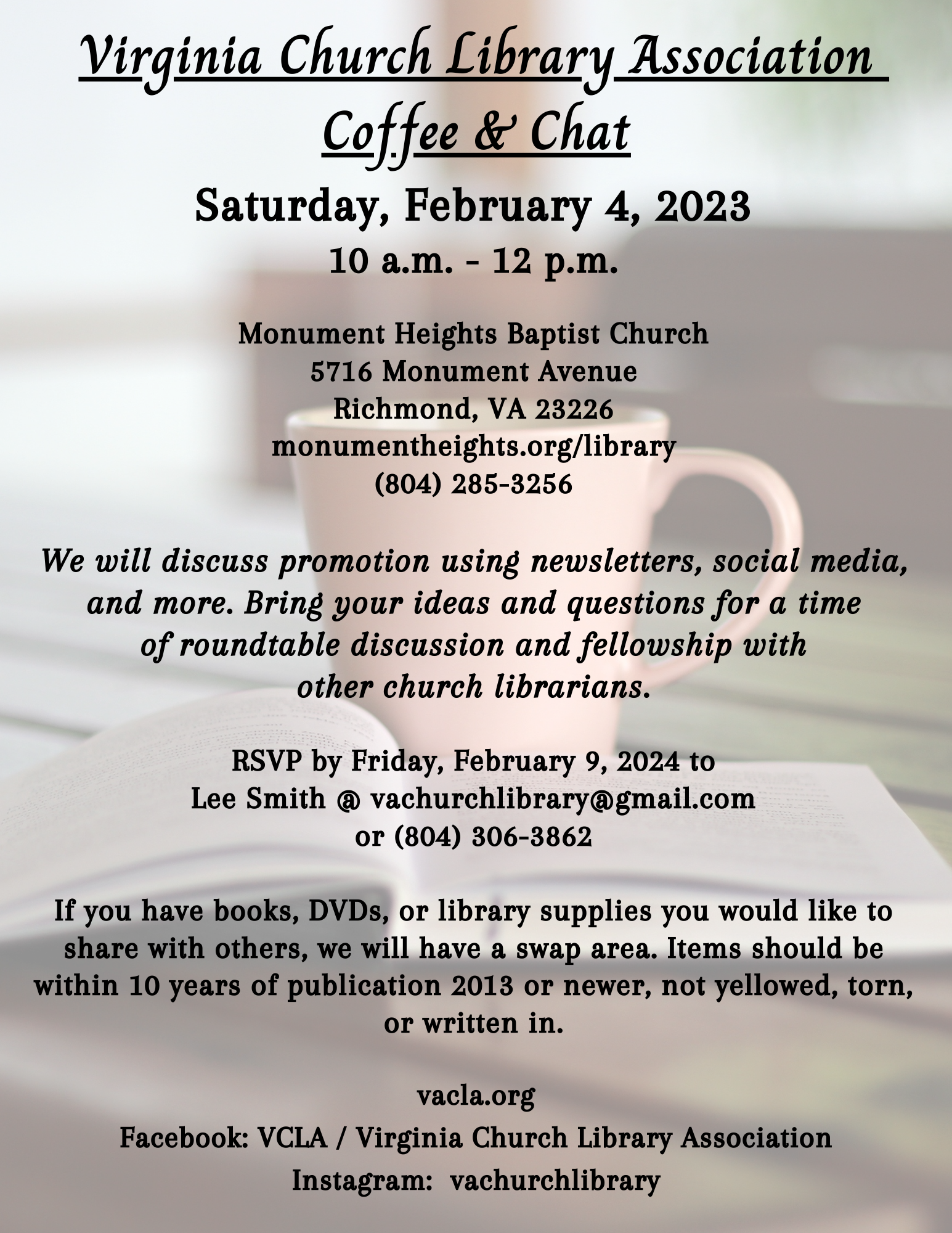 RSVP by Friday, February 9, 2024, to Lee Smith at either vachurchlibrary@gmail.com or (804) 306-3862.